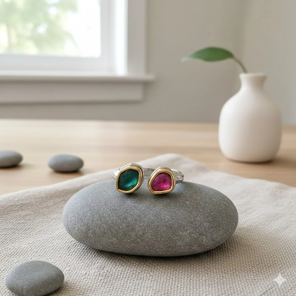 Χειροποίητο προσαρμόσιμο δαχτυλίδι κατασκευασμένο με ασήμι κ χρυσό 14 καρατίων που δένουν με κομψότητα πέτρες τουρμαλίνης σε κόκκινη κ πράσινη απόχρωση. Μινιμαλιστική αισθητική και διαχρονική πολυτέλεια σε ένα κόσμημα που μπορεί να σας συνοδεύσει σε όλες της πλευρές της ζωής σας.