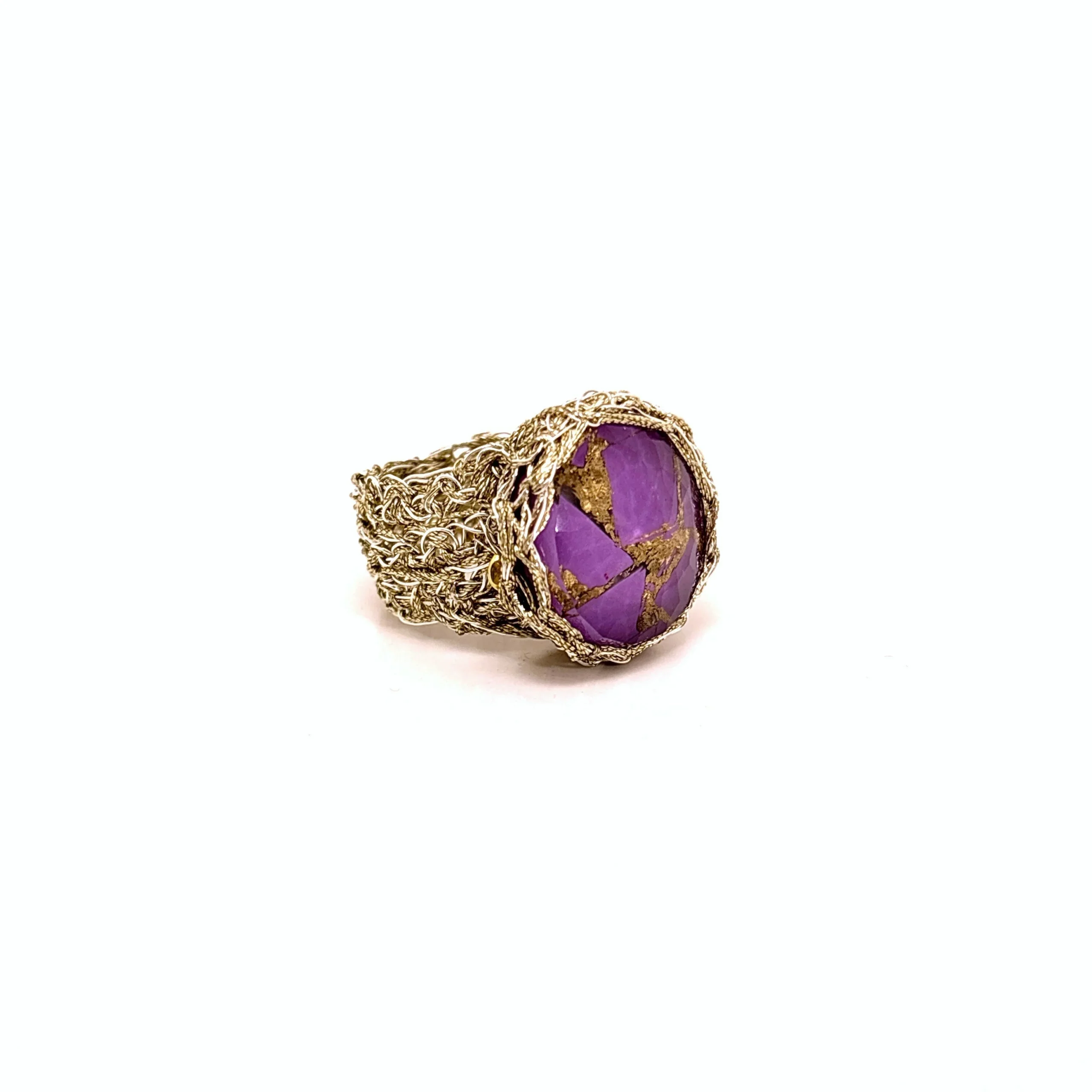 Αυτό το δαχτυλίδι είναι πλεγμένο στο χέρι με ασημένιο επιχρυσωμένο νήμα με την τεχνική κροσέ. Η σπειροειδής του πλέξη σχηματίζει κυκλικό μοτίφ το οποίο φιλοξενεί πέτρα χαλκοπυρίτη με εντυπωσιακό μωβ χρώμα και ιριδίζοντα χρυσά “νερά” που το κάνουν μοναδικό. Διατίθεται σε νούμερο 57 αλλά υπάρχει η δυνατότητα μικρής προσαρμογής.