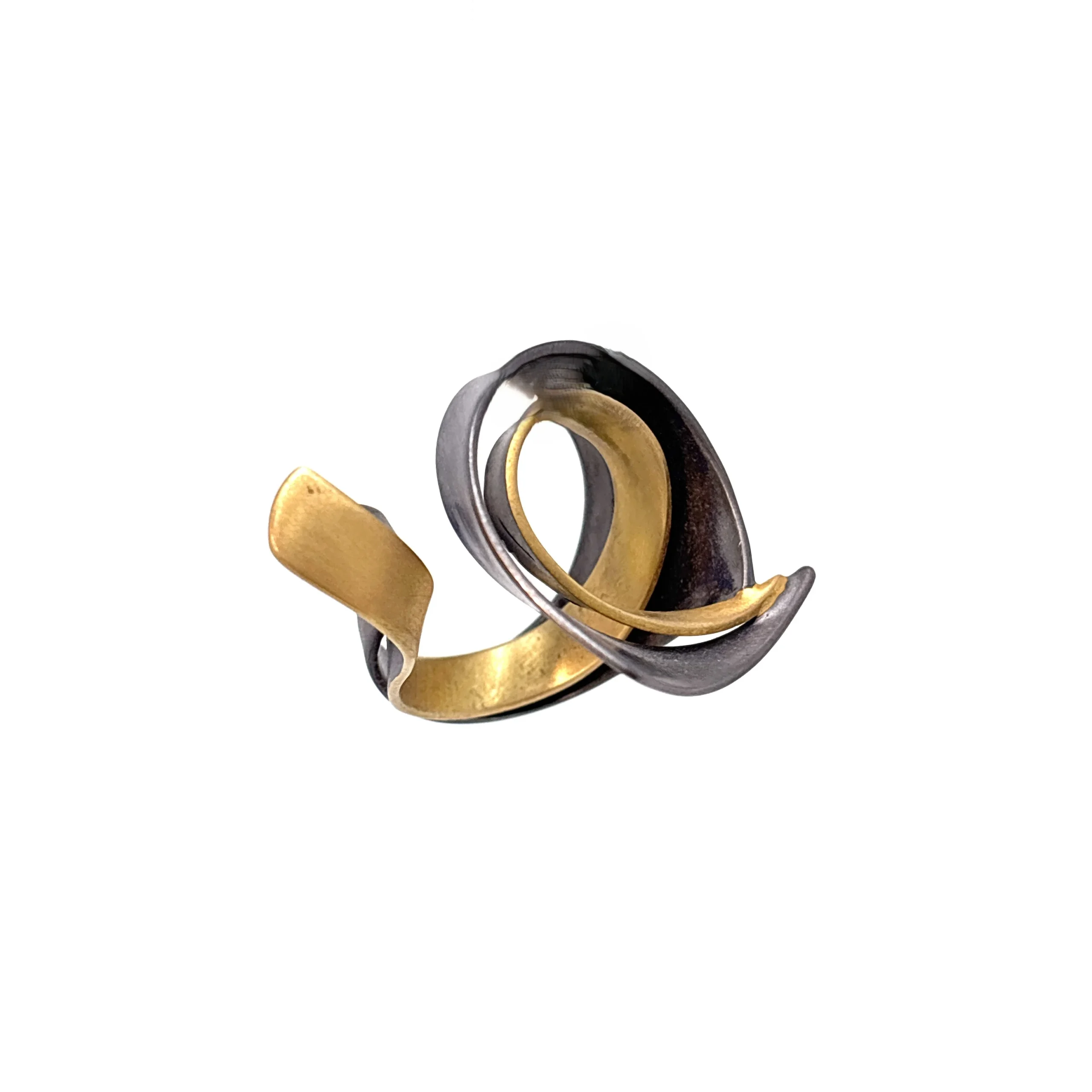 Αυτό το ιδιαίτερο δαχτυλίδι είναι κατασκευασμένο από ασήμι. Σχηματικά αποτελείται από δυο σχεδόν εφαπτόμενα παράλληλα τμήματα, επίχρυσο εσωτερικά και οξειδωμένο εξωτερικά που μοιάζουν να απεικονίζουν κορδέλες σε κίνηση και θυμίζουν το καλλιγραφικό γράμμα “θ”. Οι καμπύλες του αγκαλιάζουν τα δάχτυλα και δημιουργούν ένα ενδιαφέρον οπτικό παιχνίδι. Διατίθεται σε νούμερο 54 αλλά 0 σχεδιασμός του μας επιτρέπει να προσαρμόσουμε το μέγεθος του στις ανάγκες μας.