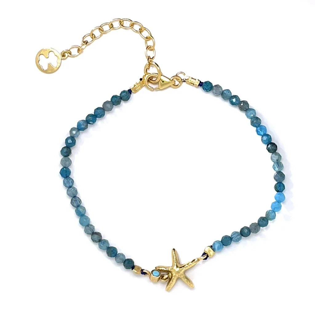Βραχιόλι κατασκευασμένο από ασήμι, δεμένο με πέτρες απατίτη που απεικονίζει έναν αστερία. Το επιχρύσωμα των ασημένιων στοιχείων μαζί με το χαρακτηριστικό μπλε/γαλάζιο χρώμα του απατίτη περιμετρικά του βραχιολιού αλλά κ σε ξεχωριστό μοτίφ δίπλα από τον αστερία, δημιουργούν τον απόλυτο καλοκαιρινό συνδυασμό, χωρίς αυτό όμως να αποτελεί δέσμευση από το να μας συνοδεύει καθ’ όλη την διάρκεια του χρόνου.