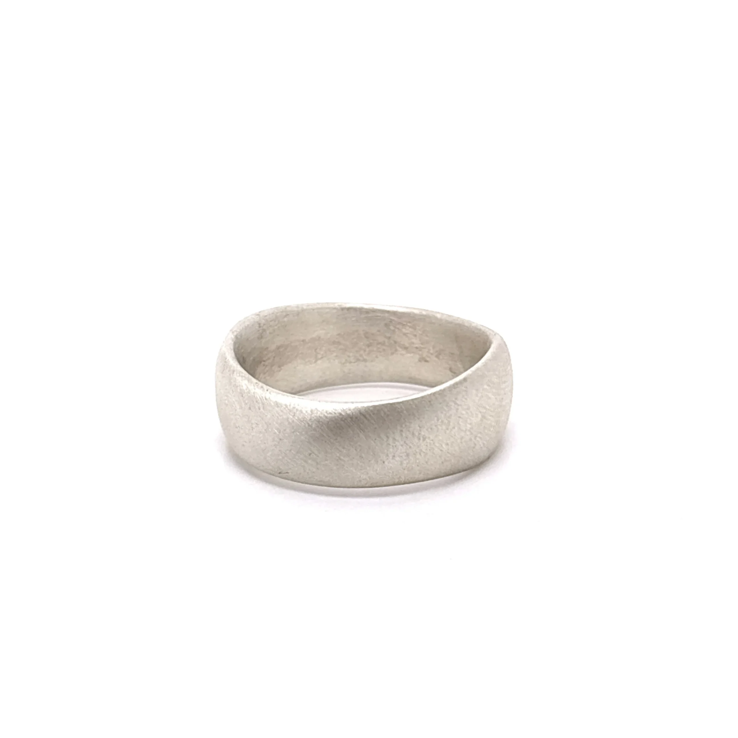 Χειροποίητο ασημένιο δαχτυλίδι τύπου βέρα . Με ματ αίσθηση και κυματιστό σχεδιασμό αποτελεί μια ενδιαφέρουσα και εναλλακτική προσέγγιση σε αυτό το κλασσικό κόσμημα. Οι καμπύλες του αγκαλιάζουν το δάχτυλο και το κανουν το ιδανικό μιας και μπορεί να φορεθεί είτε μόνο του είτε να συνδυαστεί με ευκολία με οποιοδήποτε άλλο δαχτυλίδι .Διατίθεται σε ποικιλία μεγεθών. (51, 53, 55, 57, 60)