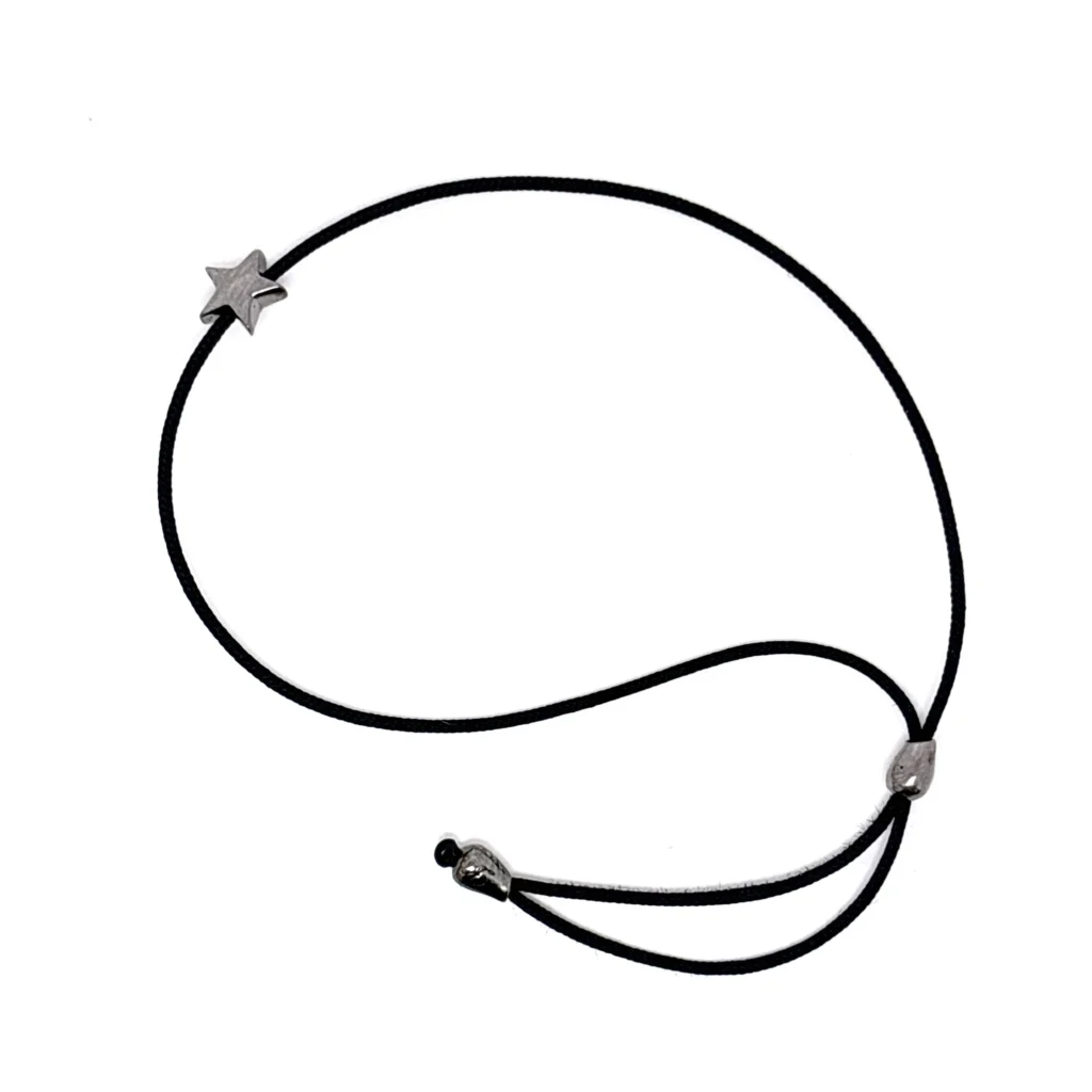 Αυτό το χειροποίητο ασημένιο οξειδωμένο βραχιόλι με τον μινιμαλιστικό σχεδιασμό του απεικονίζει ένα μικρό αστέρι. Είναι δεμένο με σχοινί και έχει προσαρμόσιμο μέγεθος. Οι λιτές γραμμές του, το καθιστούν μια σίγουρη επιλογή που συνδυάζεται εύκολα με οποιοδήποτε στιλ αλλά και με άλλα κοσμήματα για την επίτευξη ενός εντυπωσιακού λουκ.