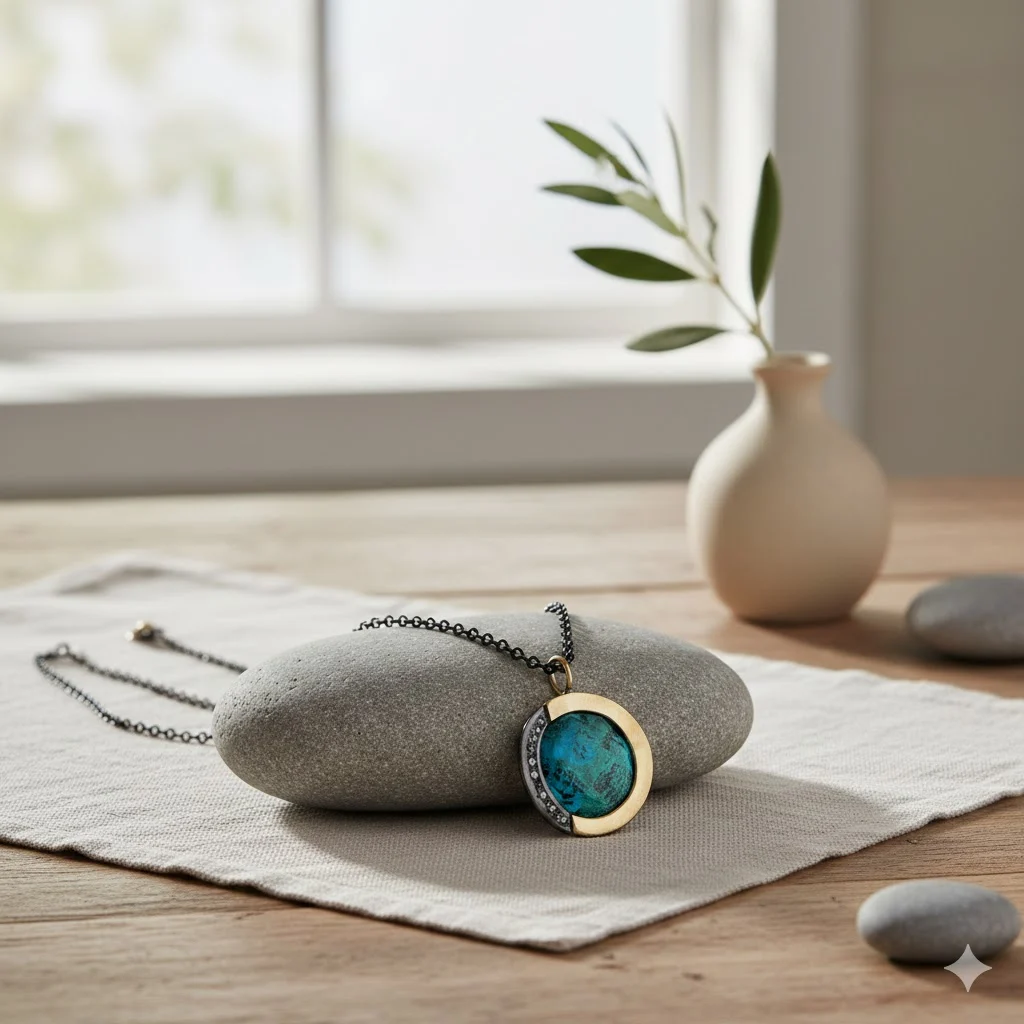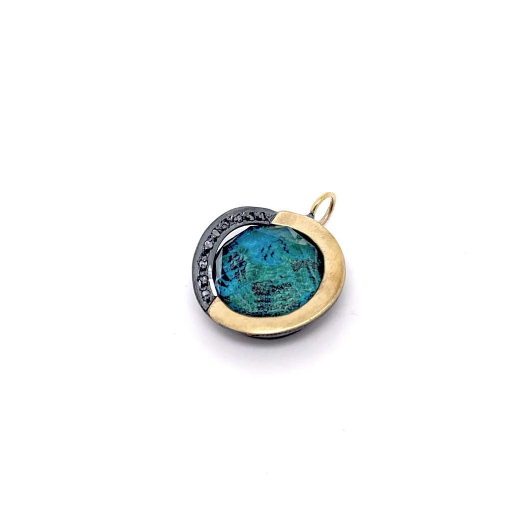 Χειροποίητο μοτίφ κατασκευασμένο από οξειδωμένο ασήμι το οποίο το συναντάμε στο στρογγυλό καστόνι που φιλοξενεί χρυσόκολλα με τις χαρακτηριστικές μπλε και πράσινες αποχρώσεις. Λεπτομέρεια από χρυσό 14 καρατίων στο μοτίφ σε σχήμα ημικυκλίου ενώ το οξειδομένο μέρος που είναι ελαφρώς ανασηκωμένο, φιλοξενεί διαμάντια εξαιρετικής ποιότητας. Ισορροπία μεταξύ κλασικής και σύγχρονης αισθητικής. Ένα κομψοτέχνημα ιδανικό για ανθρώπους με εκλεπτυσμένο γούστο.
