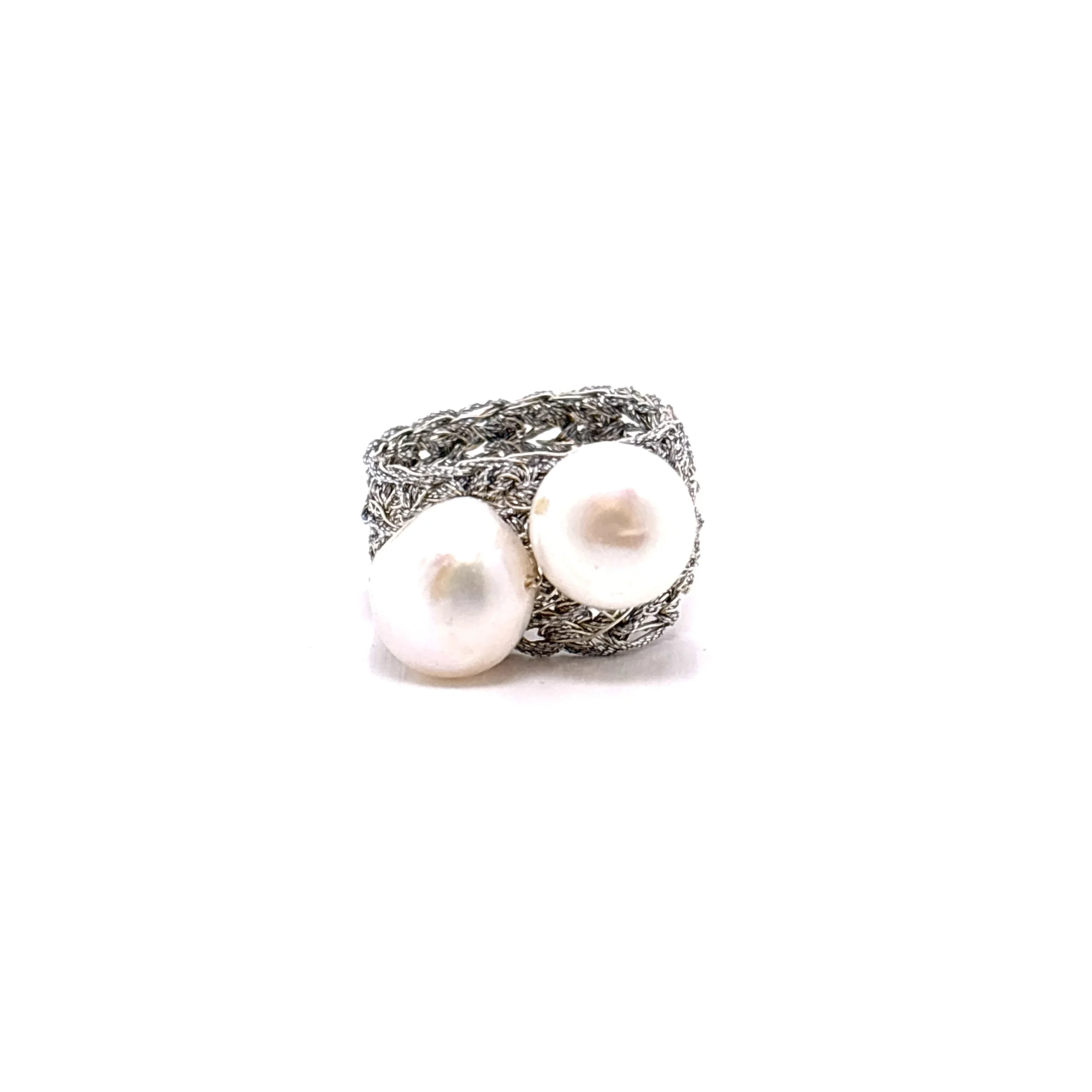 Δαχτυλίδι πλεγμένο στο χέρι από ασημένιο νήμα με την τεχνική κροσέ. Με φαρδιά πλέξη αγκαλιάζει το δάχτυλο ενώ ιδιαίτερο αισθητικό ενδιαφέρον παρουσιάζουν τα δύο μαργαριτάρια που είναι διαγώνια πλεγμένα στο κέντρο του δαχτυλιδιού. Διατίθεται σε νούμερο 60 αλλά υπάρχει η δυνατότητα μικρής προσαρμογής.