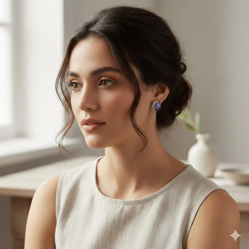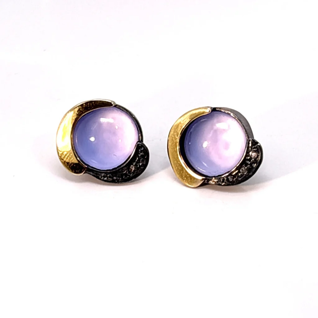 Αυτά τα σκουλαρίκια κατασκευασμένα στο χέρι από οξειδωμένο ασήμι, χρυσό 18 καρατίων και εξαιρετικής ποιότητας μωβ αχάτη, mother of pearl και διαμάντια σε μια σύνθεση που αποπνέει αέρα πολυτέλειας κ κομψότητας. Οι ιδιαίτεροι ιριδισμοί σε μοβ αποχρώσεις είναι αποτέλεσμα της τεχνικής ντουμπλέ. Ο κρύσταλλος του αχάτη τοποθετείτε επάνω από την mother of pearl χαρίζοντας αυτό το μοναδικό αποτέλεσμα που αναδεικνύεται με τον συνδυασμό της κίνησης και του φωτισμού. Ο μοντέρνος σχεδιασμός τους, σε συνδυασμό με τα κλασικά στοιχεία τους, αποτελεί μια ιδιαίτερη επιλογή η οποία θα προσθέσει κύρος και χάρη στις εμφανίσεις σας.