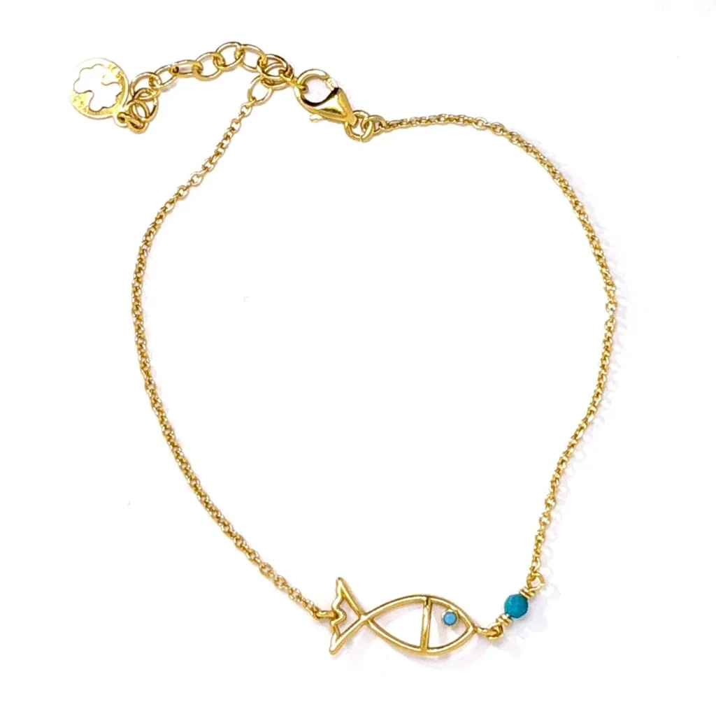 Βραχιόλι κατασκευασμένο από ασήμι που απεικονίζει με λιτές γραμμές ένα ψαράκι. Το επιχρύσωμα μαζί με το τιρκουάζ στα μάτια και στην ροή του βραχιολιού δημιουργεί τον απόλυτο καλοκαιρινό συνδυασμό, χωρίς όμως να μας δεσμεύει από το να το φοράμε και κατά την διάρκεια όλου του χρόνου.