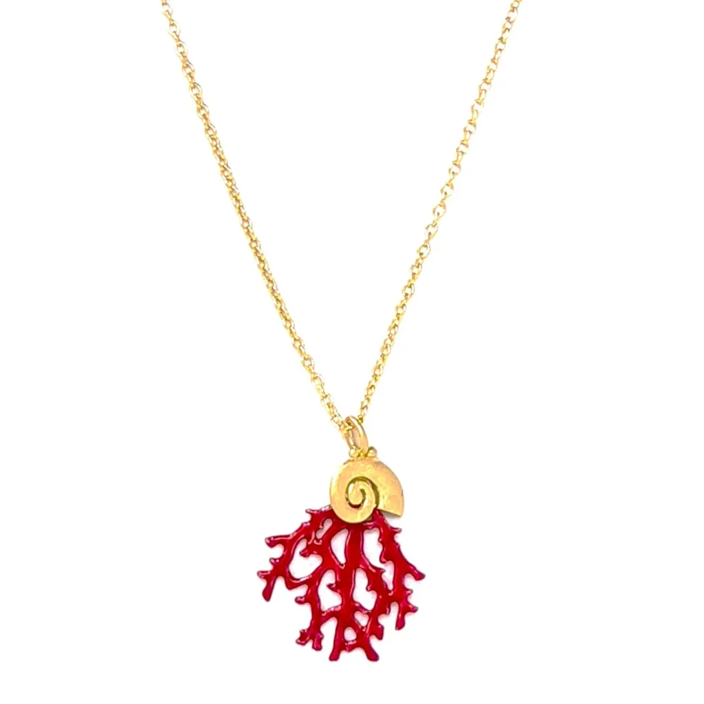 Ασημένιο επίχρυσο κολιέ σε σχήμα κοχύλι που καταλήγει σε κοράλλι από κόκκινο σμάλτο. Ο συνδυασμός του εντονου κόκκινου στο σμάλτο με το επιχρύσωμα δημιουργούν μια ενδιαφέρουσα αντίθεση που δεν περνάει απαρατήρητη. Ένα κόσμημα που είναι ιδιαιτέρως δημοφιλές τους καλοκαιρινούς μήνες.