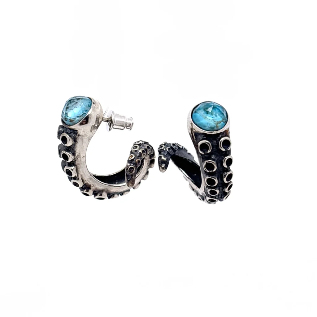 Σκουλαρίκια κατασκευασμένα στο χέρι από ασήμι. Απεικονίζουν με ρεαλιστική λεπτομέρεια δύο πλοκάμια χταποδιού σε σχήμα σπείρας. Το χρώμα του ασημιού ξεχωρίζει στις λεπτομέρειες του σχεδίου που προεξέχουν ενώ η μαύρη οξείδωση τονίζει ακόμα περισσότερο τον τρισδιάστατο σχεδιασμό αυτού του κοσμήματος προδίδοντας επίσης μια πιο ακατέργαστη και οργανική αίσθηση. Στο κεντρικό καστόνι των σκουλαρικιών συναντάμε πέτρα τιρκουάζ ντουμπλέ. Το βάρος του σε ασήμι είναι 15γρ.