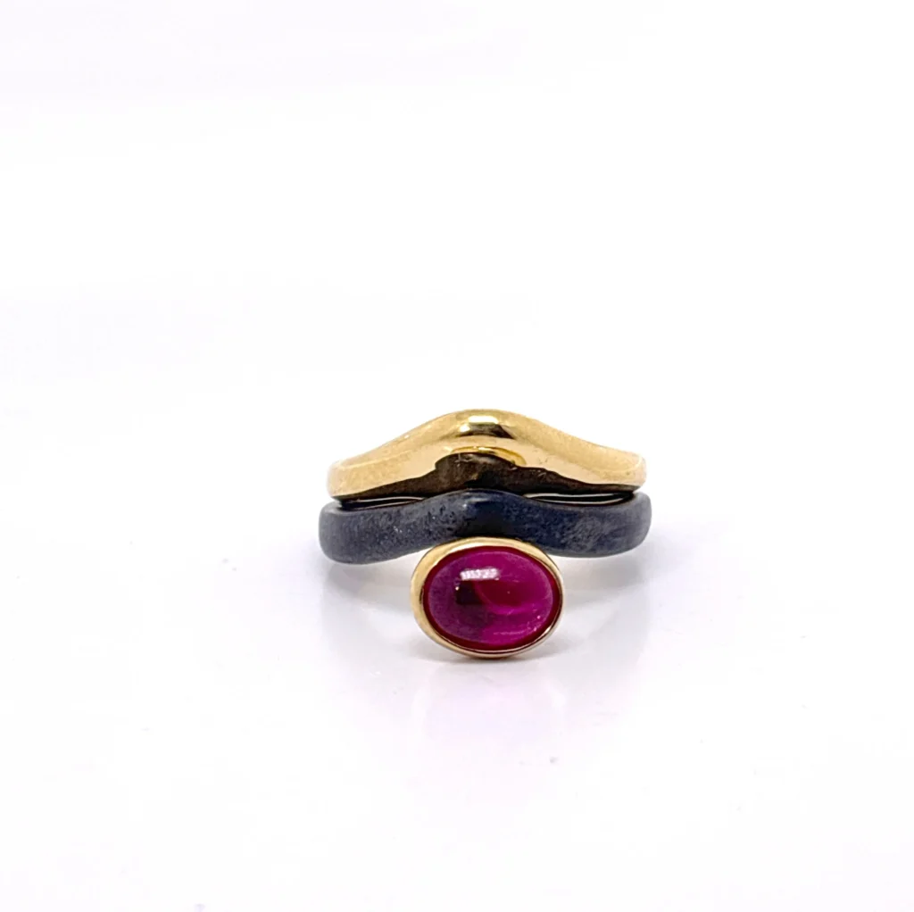 Δαχτυλίδι κατασκευασμένο στο χέρι από ασήμι. Αποτελείται από δυο δαχτυλίδια, το ένα με οξείδωση ενώ το δεύτερο είναι επιχρυσωμένο και φιλοξενεί ζιργκόν που αγκαλιάζει κ συγκρατεί το οξειδωμένο τμήμα του. Μας δίνει την δυνατότητα να τα φορέσουμε μαζί ή μεμονωμένα. Ένα ιδιαίτερο κόσμημα με μεσαιωνική αισθητική.