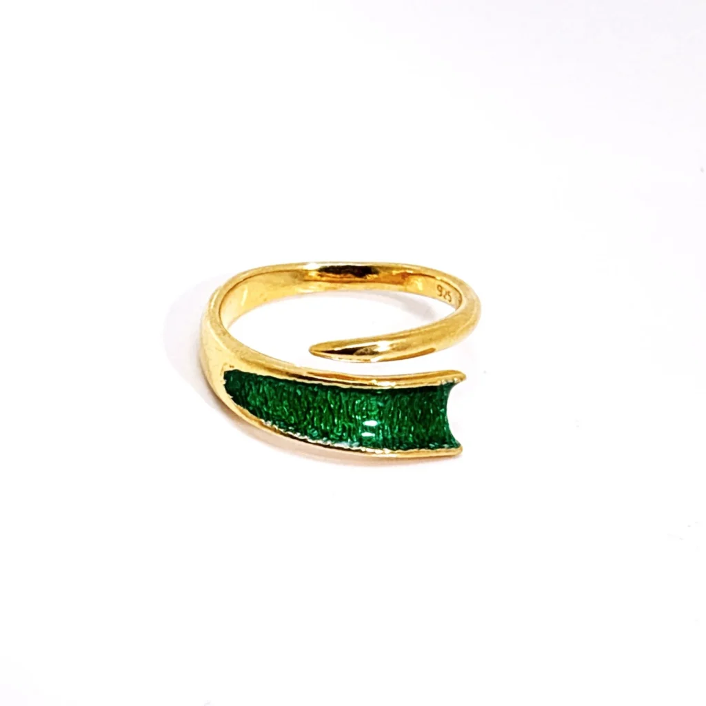 Αυτό το ιδιαίτερο αλλά ταυτόχρονα ευσυνδύαστο χειροποίητο δαχτυλίδι με επιχρυσωμένο ασήμι και ρητίνη σε ζωηρό πράσινο χρώμα σε σχέδιο σπιράλ, αποτελεί την επιτομή του αστικού κοσμήματος. Προσδίδει χαρακτήρα ενώ την ίδια στιγμή με την απλότητα των σχεδιαστικών γραμμών του, είναι σε απόλυτη αρμονία με οποιοδήποτε και να είναι το προσωπικό σας στιλ. Διατίθεται σε νούμερο 54 αλλά υπάρχει η δυνατότητα προσαρμογής.