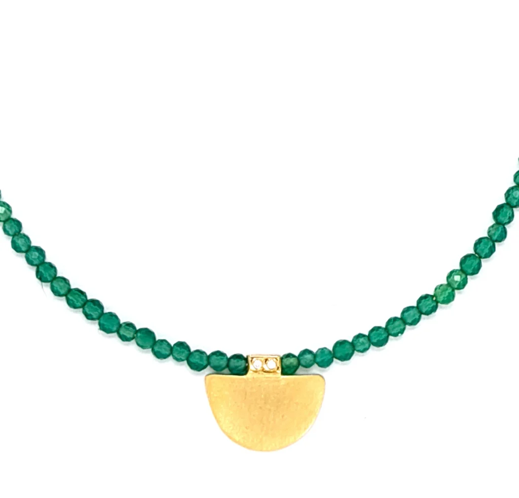 Με έμπνευση από την αρχαία Ελλάδα αυτό το χειροποίητο επίχρυσο κολιέ είναι κατασκευασμένο από ασήμι. Το σχέδιο του μοτίφ μας παραπέμπει στα αγάλματα της κυκλαδικής περιόδου με τον χαρακτηριστικό αρχαϊκό μινιμαλισμό τους, ενω διακοσμείται από δυο διακριτικά ζιργκόν. Το δέσιμο του έχει γίνει με πέτρες πράσινου αχάτη που φημίζονται για το ζωηρό τους χρώμα. Η καθαρότητα του σχεδιασμού σε συνδυασμό με την διαχρονικότητα και την κομψότητα του, το καθιστούν την απόλυτη επιλογή για καθημερινές αλλά και πιο επίσημες εμφανίσεις.