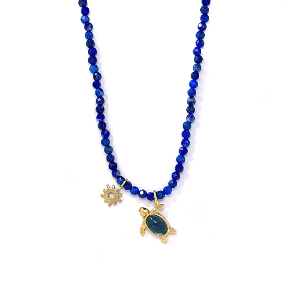 Το πρώτο αρχαίο νόμισμα που βρέθηκε στην Ελλάδα, βρέθηκε στο νησί της Αίγινας κι απεικόνιζε μια χελώνα. Αναπόφευκτα το σύμβολο της χελώνας είναι αναπόσπαστα συνδεδεμένο με την Αίγινα. Σε αυτό το κολιέ με ασημένιες επίχρυσες λεπτομέρειες πλαισιωμένες από λάπις λάζουλι βλέπουμε την μοντέρνα εκδοχή του αρχαίου νομίσματος.